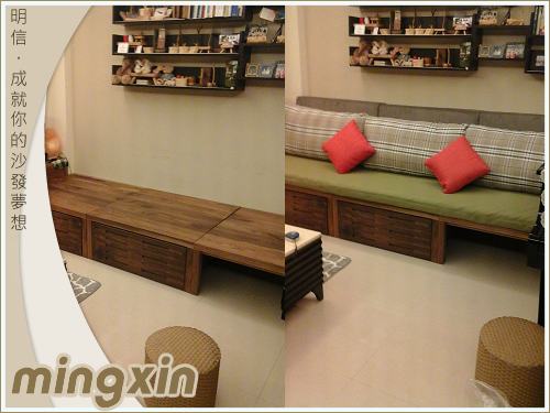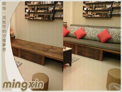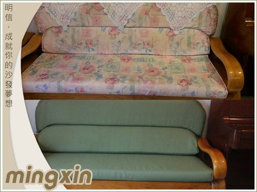 上圖為華小姐家中原先的椅墊圖.下圖為換布後的成果圖.由於坐墊為消耗品.所以座墊泡棉更新.並且更改為2人連結.而背墊幫華小姐增添了絲棉花.看起來也更飽滿了.