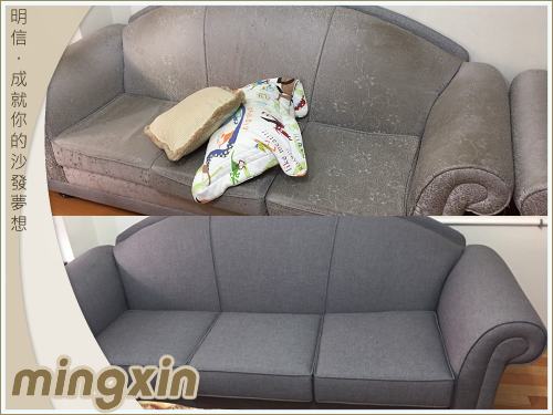 上圖為張小姐家中原先的三人座沙發,由於家中重新裝潢,所以趁這次機會換布整修,建議張小姐在沙發底座使用素色布,更能增添沙發質感,沙發翻新送回後,張小姐也相當滿意,下圖即為換布翻新後的成果圖。