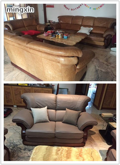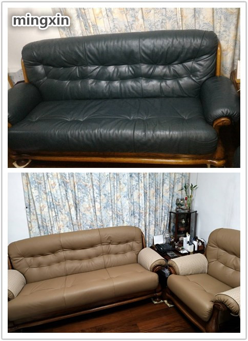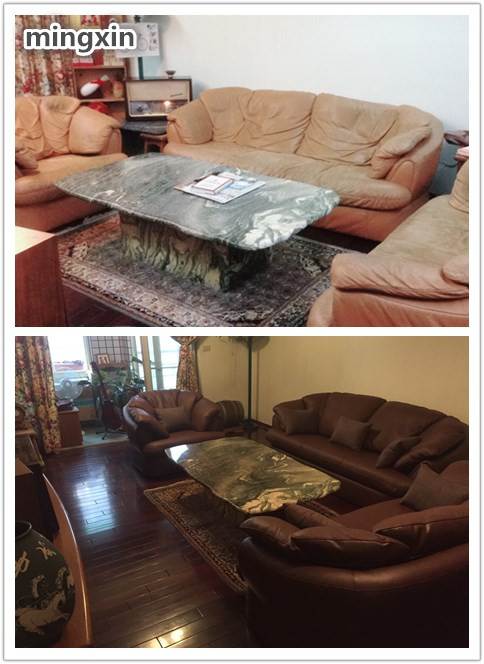 上圖為楊先生家中原先的2+3+4沙發原貌,由於家中即將辦喜事,所以趁此機會將沙發換皮翻新,牛皮的顏色選擇了帶有點大地與可可的色系,讓整組沙發沉穩中帶有現代,下圖即為換皮翻新後的成果圖。