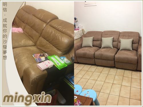 左圖為周先生家中原先的三人座皮沙發,由於沙發還是帶有五金功能的,又是一張三人座沙發,單位成本其實高許多,在洽詢討論的過程中,時間稍久,最後還是不負周先生的期許,完成了沙發。右圖即為換布翻新後的成果圖。