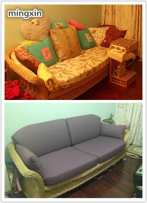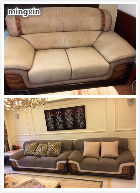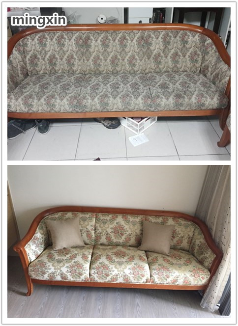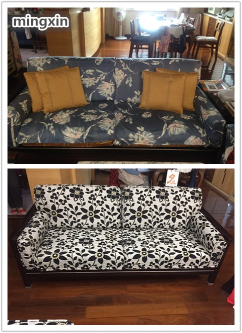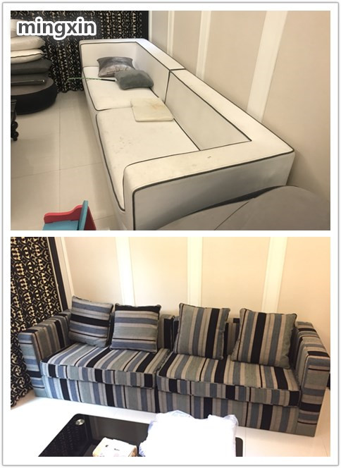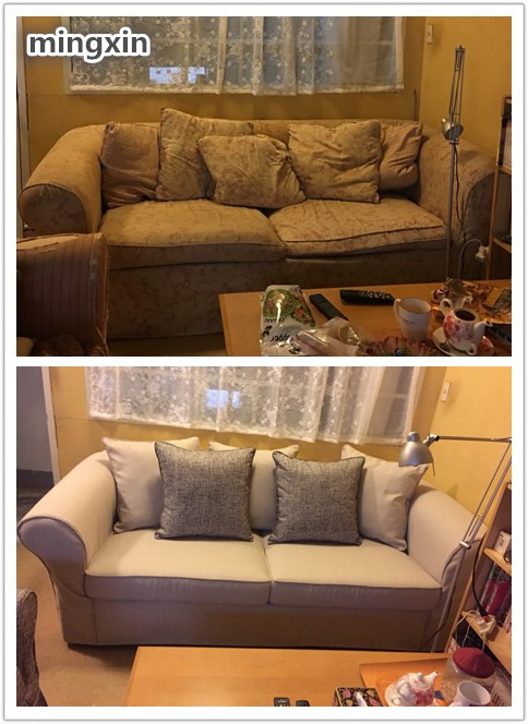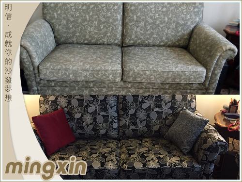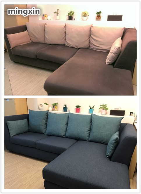 上圖為周小姐原先的布沙發,惜物的周小姐覺得沙發骨架還相當堅固,材質也扎實,丟棄實在可惜,所以委託我們換布翻新。細心的周小姐還特地叫我們為沙發座墊鋪上一層防塵綿,使沙發能阻隔看不見的灰塵。下圖即為換布後的成果圖。