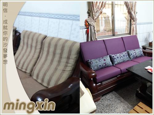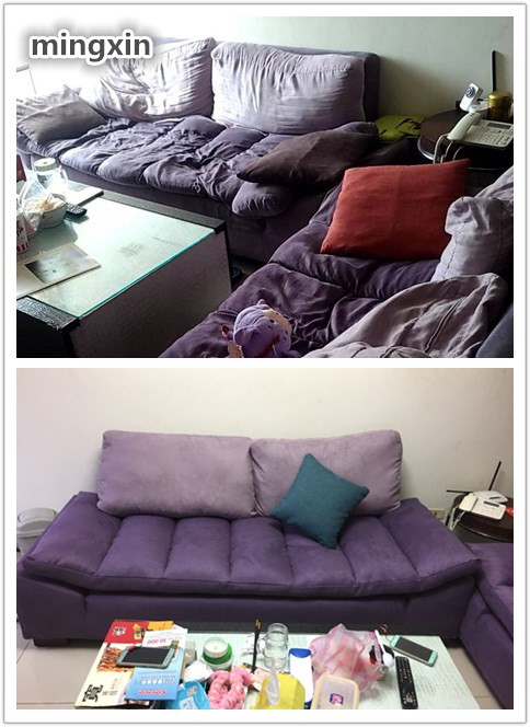 上圖為王小姐家中原先的2+3沙發,也是使用許久,布髒損了,整個墊子變的塌軟,深愛紫色的王小姐還是選擇了紫色布款,只是材質是耐磨的防貓抓布,師傅也將墊子在填充絲棉花,使其更飽滿,更有支撐力,下圖即為換布翻新後的成果圖。感謝王小姐的耐心等候,年前的洽詢讓我們年後才將沙發運回施工。