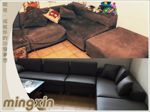 上圖為蔡先生家中原先的L型布沙發,由於座墊部分已塌陷嚴重,布也髒損了,所以最後還是決定整組翻新,只是蔡先生這次決定以皮革的材質,以防塵?,也好整理,下圖即為換皮翻新後的成果圖。也謝謝蔡先生耐心等候,讓我們年後才將沙發收回施工。